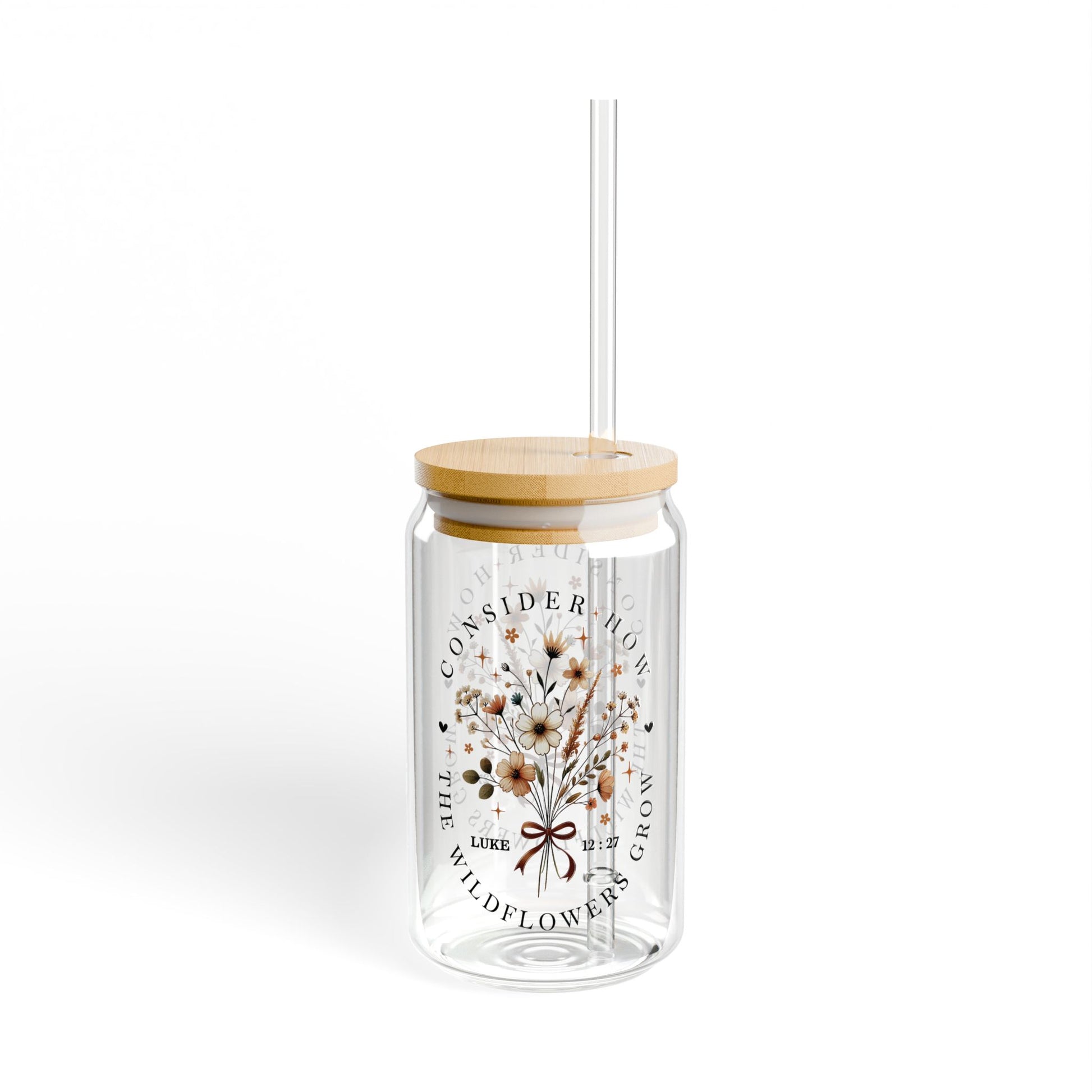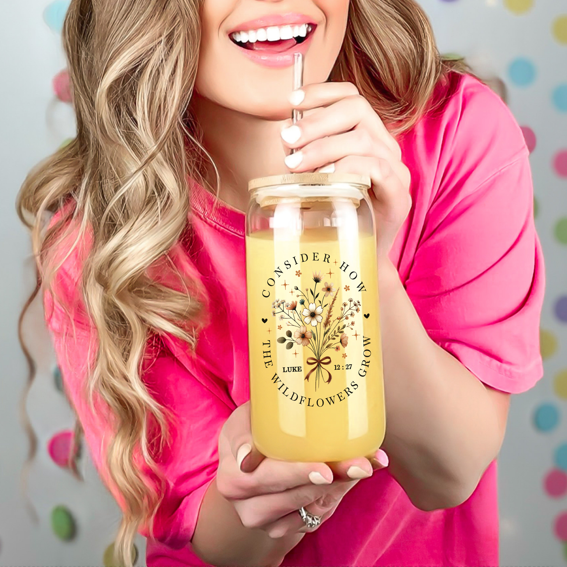 Consider the Wildflowers – Luke 12:27 Glass Can Cup (16oz)