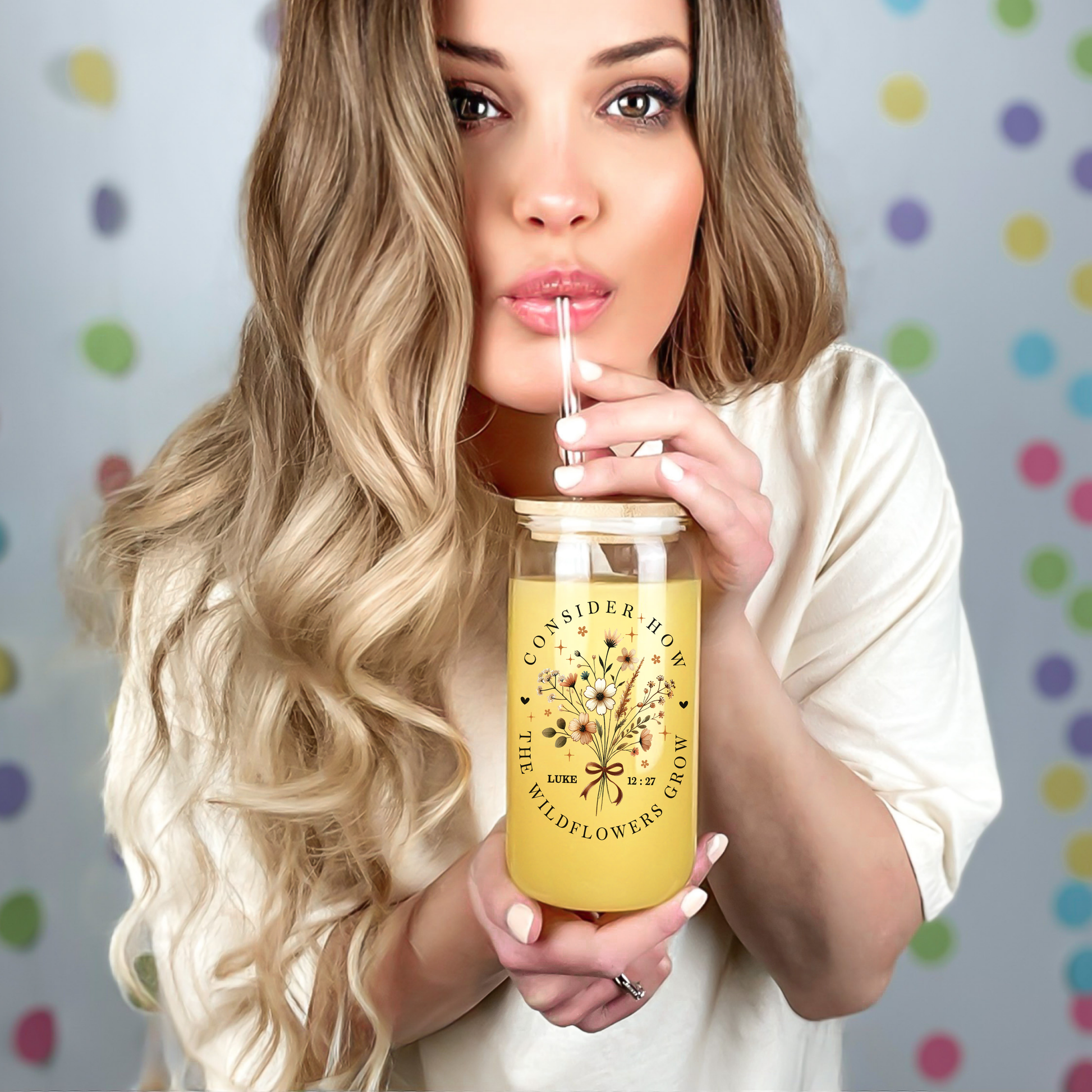 Consider the Wildflowers Cup | Luke 12:27 Scripture Glass Sipper Cup, 16oz Tumbler with Bamboo Lid and Straw, Christian Iced Coffee Cup