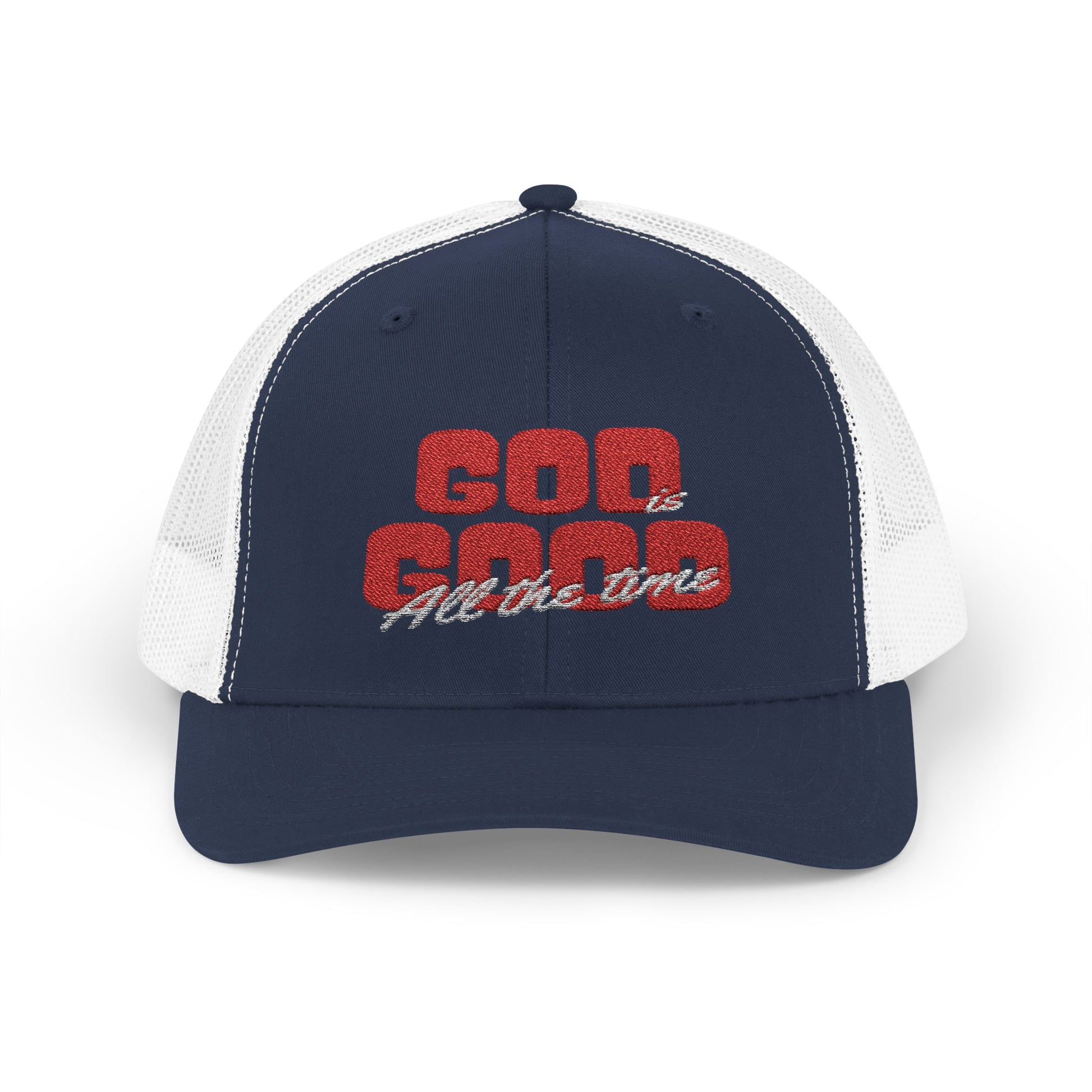 Carry a constant reminder of God’s goodness with this embroidered trucker hat. Featuring bold red “God Is Good” lettering with the phrase “All the Time” in script, this cap combines modern style with a powerful declaration of faith. With its breathable mesh back and durable structure, it’s perfect for casual outings, church events, beach days, or everyday wear.