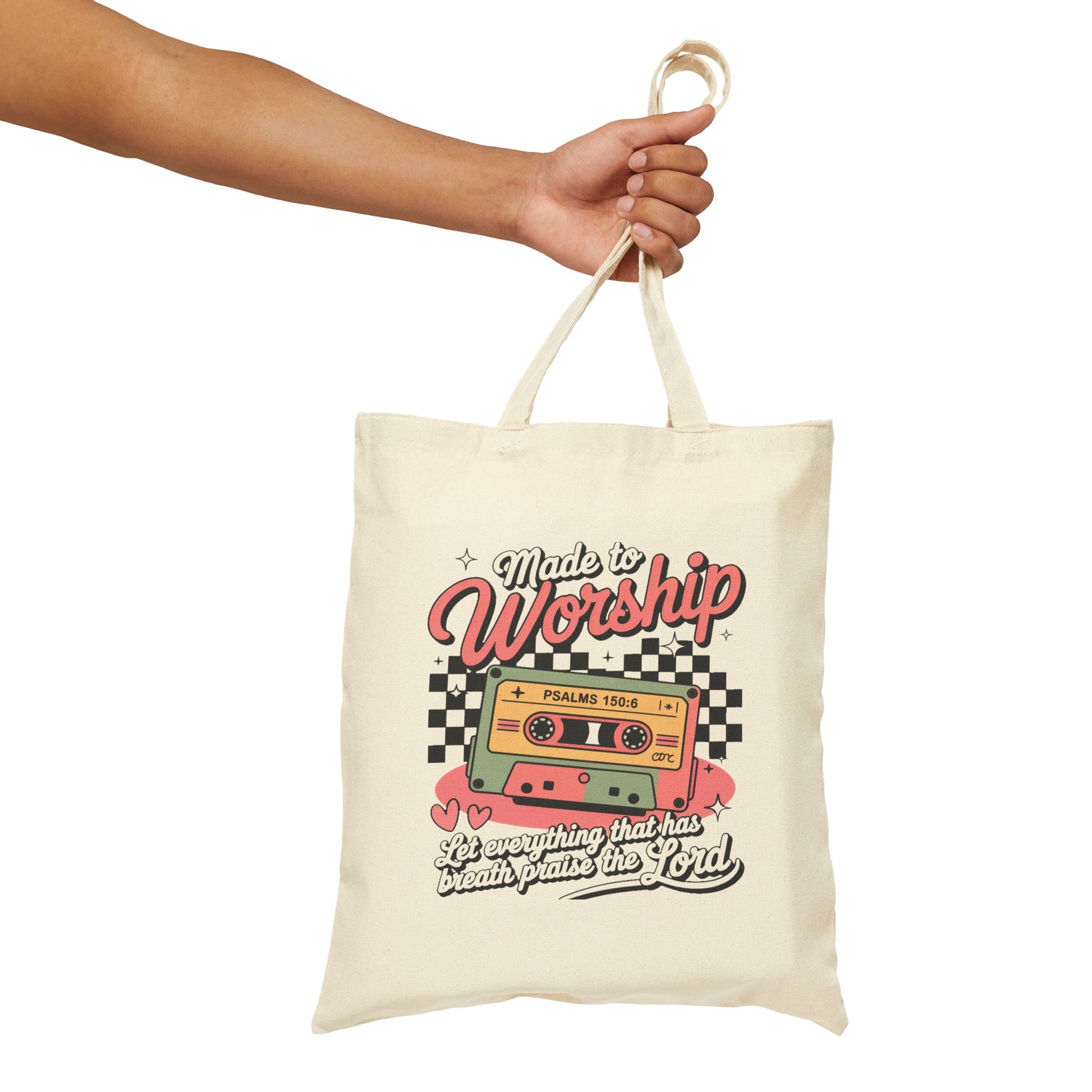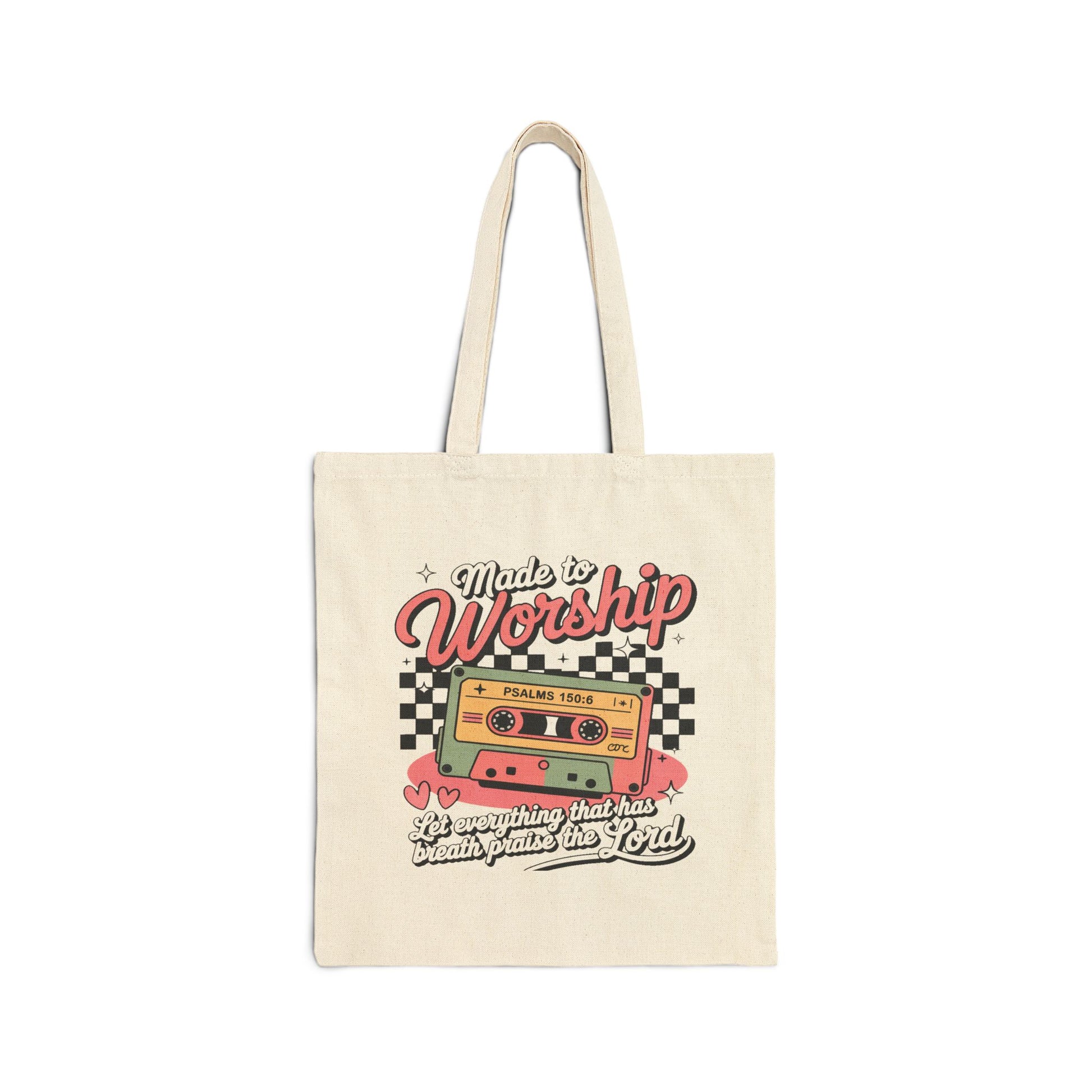 This retro-style Christian tote bag features a vibrant cassette tape design and the powerful reminder from Psalm 100:2 — "Serve the Lord with gladness; come before Him with joyful songs." Whether you’re heading to church, Bible study, school, or the farmer’s market, this bag keeps your faith front and center in style.