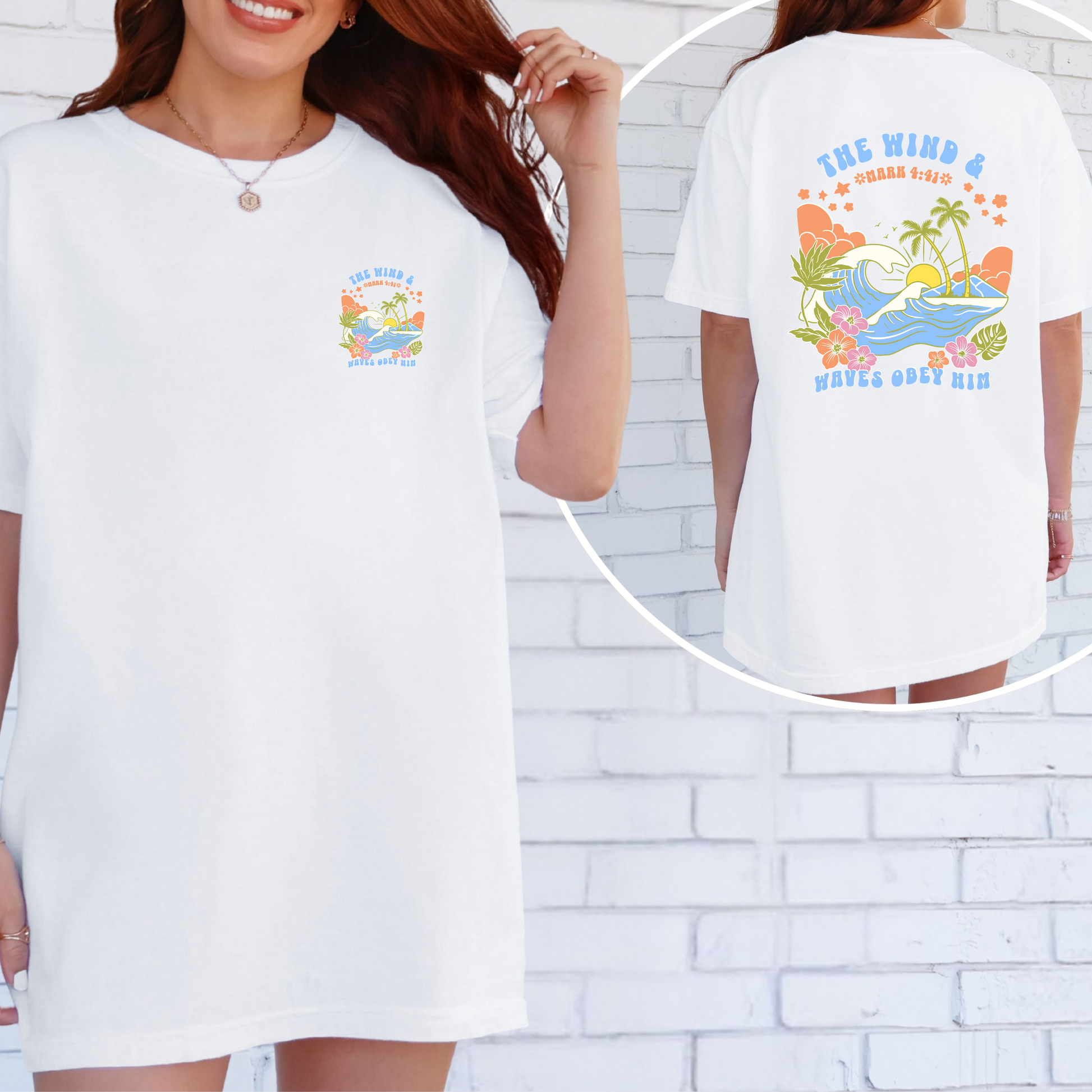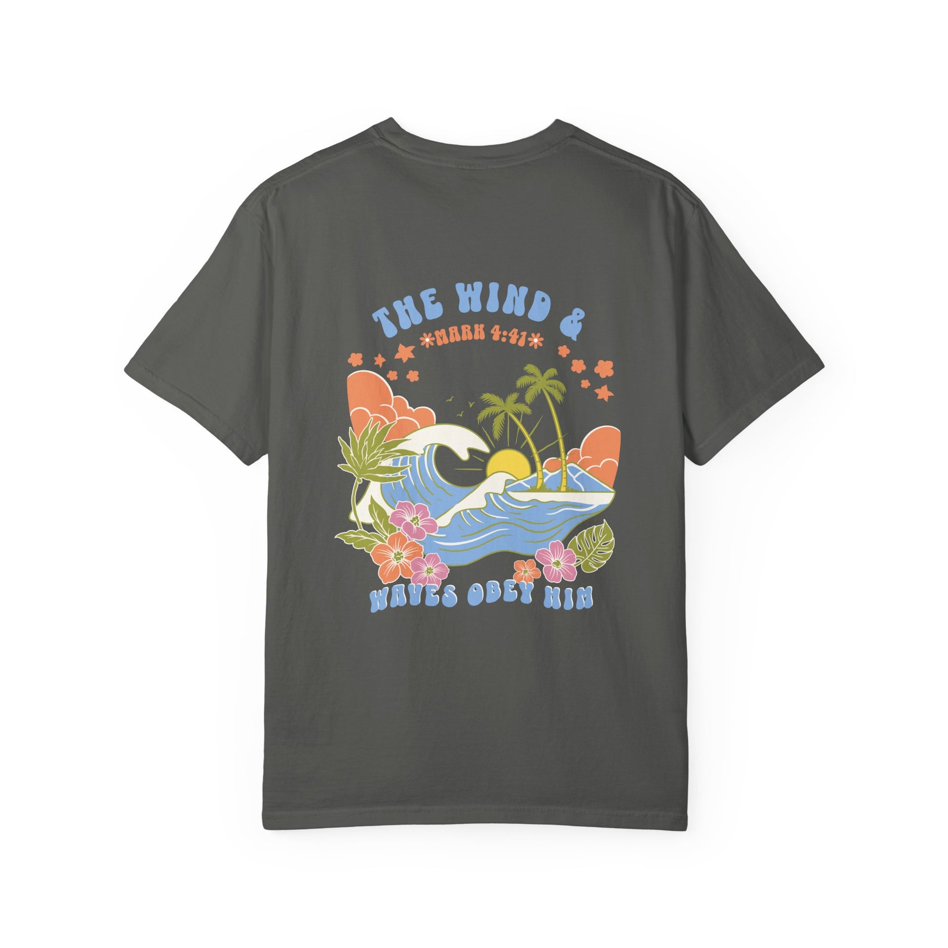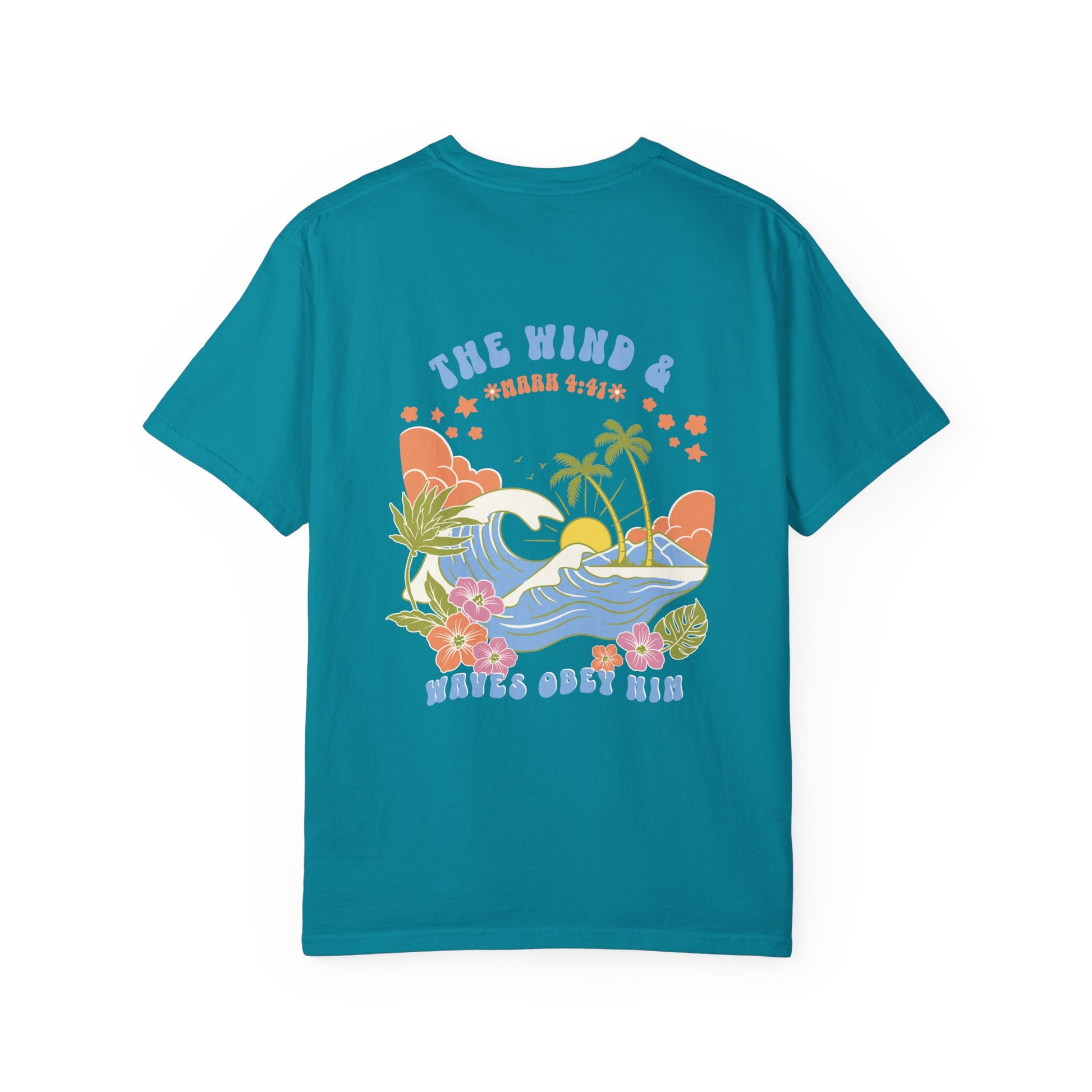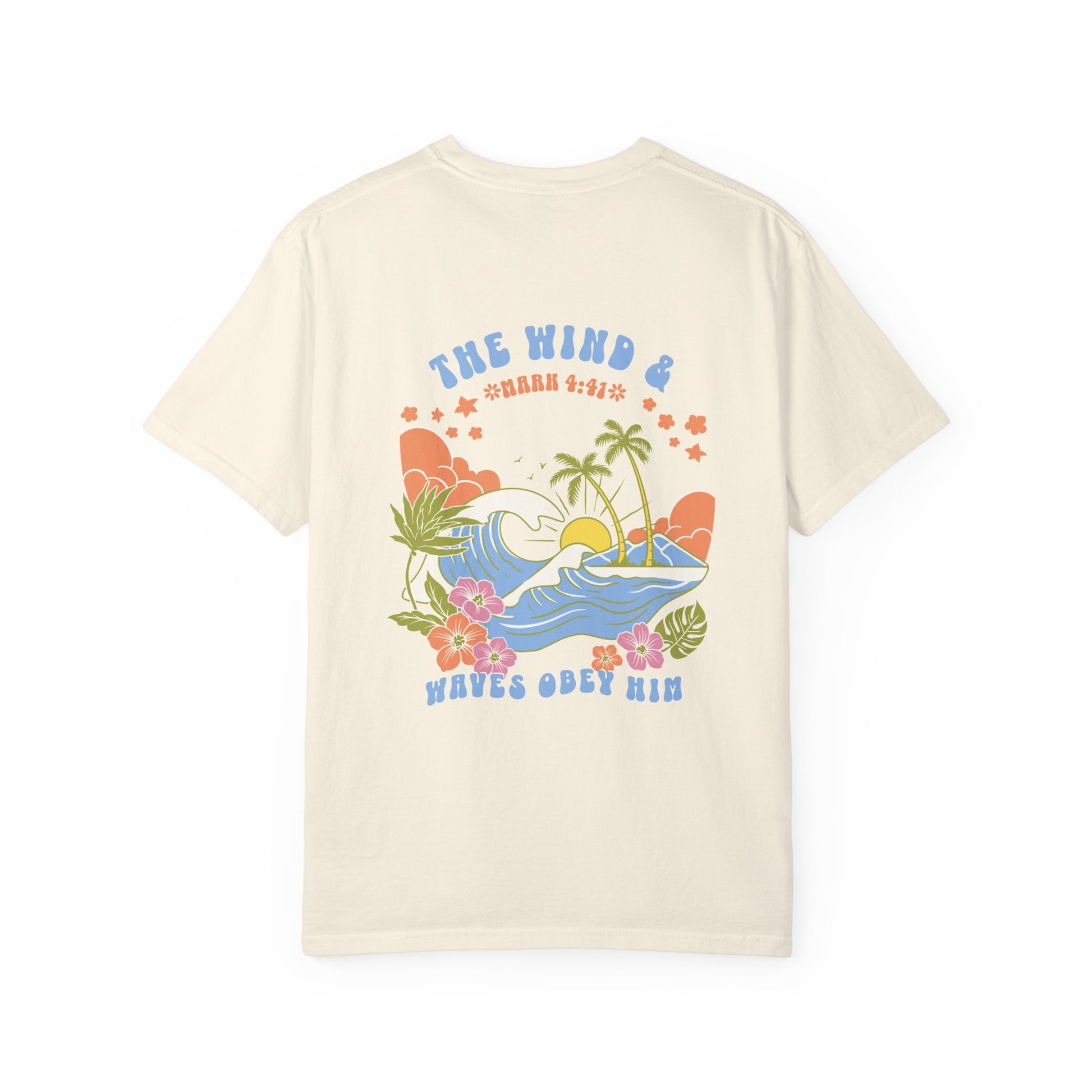 This coastal Christian tee is more than just a shirt—it’s a reminder of His power and peace. Featuring a vibrant beach scene with palm trees, rolling waves, and the Scripture “The wind and waves obey Him” (Mark 4:41), this shirt is designed for the woman of faith who is anchored in truth and walking with boldness.